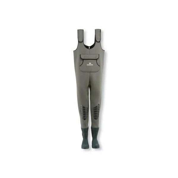 Neoprene chest waders with rubber boots with cleated sole. Made of 4mm double coated neoprene and breathable upper part. All seams are taped and 100% waterproof.