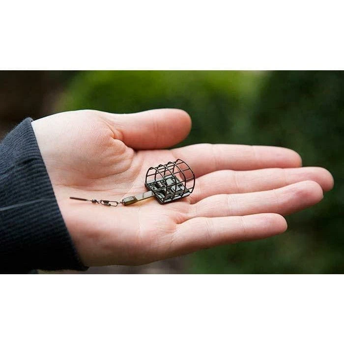 Drennan Cage Feeders feature an in-built swivel to avoid line tangles. Finished in anti-flash dark olive green that perfectly matches the neat, low-profile lead.