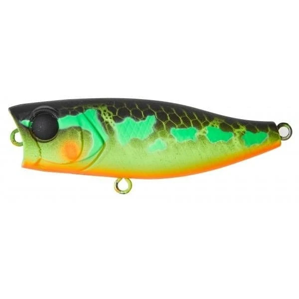 This small popper is an updated version of the CHUBBY. Simply fantastic when predators are chasing prey of the same size as the lure (larvae, amphibians or fry). Compact and well proportioned, the lure casts like a dream thanks to its internal weight. The Chubby popper has a walking the dog type action and will splash and pop with ease imitating frightened prey. Any popper worth its salt needs to sit well when stopped. To recreate the look of the tail of a prey fish or an insect’s wings, the lure is fitted with a feather hook- sure to fool the wariest of chub or black bass.