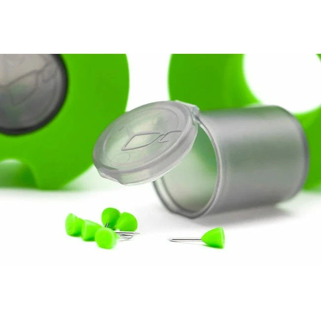 These Rig Spools have been designed to store zig rigs and chod rigs, and will neatly fit inside the Korda Tackle Box. They are made from high density foam, so your hook point can be pushed into the spool to hold the rig securely in place, without fear of damaging the point, and the other end is trapped via a pin (12 supplied with each pack). Each Rig Spool will comfortably hold up to six rigs, and you get two in each pack. The pins come in a canister which neatly fits into the centre of the spools, and as well as being used to hold the pins that it comes supplied with, they are also handy for storing other thing like Hair Stops or pieces of foam for zigs.