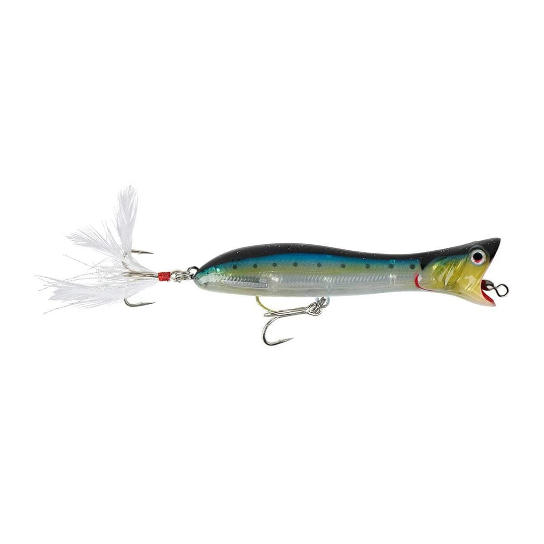Superb long casting popper, with an extreme good Popping effect! The wide open Mouth, has a great hold in the water and really pops and splashes incredible. The lure also have a great track on regular retrieve, leaving a superb bubble trail and wake bow on the surface. The rear Y-treble hook folds up along the back on the cast and gives a very stable flight. Super Hard ABS Body, with thru going wire, extra strong split rings and Big fish trebles. Great lures for big brutal Saltwater predator fish!