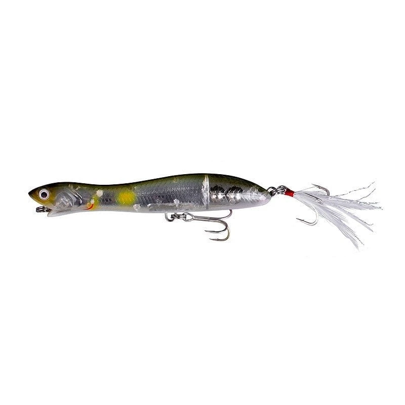Great Topwater lure, based on details from an anchovy! The open mouth gives great splashing and spitting action on walk the dog retrieve! The long arrow dynamic body, gives incredible casting distance and precision – the rear Y-treble hook folds up along the back on the cast and gives a very stable flight. Inside lazer paper gives superior, live like flash and the easy obtained wide gliding action makes this lure deadly on any top water style of fishing – Saltwater or freshwater. The best panicking prey fish imitation ever!
