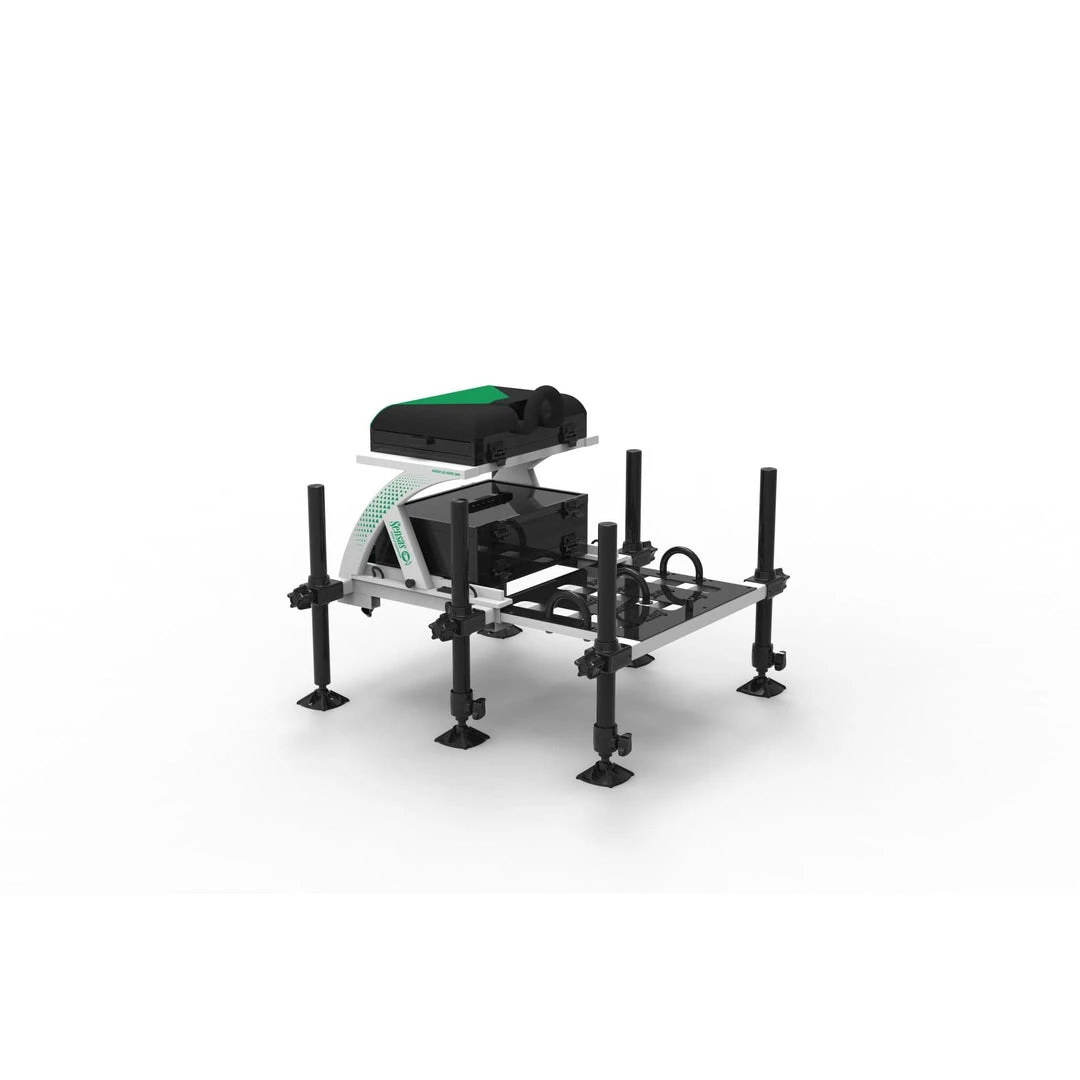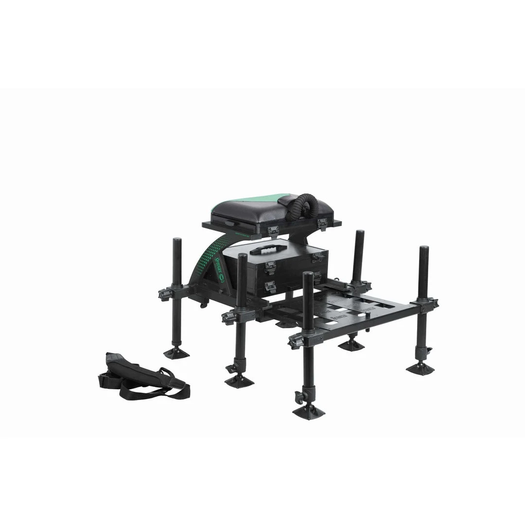 Integrated seatbox system with : 2 in 1 cushion system – Sliding footplate –Integrated keepnet attachment on the front of the footplate – 4 telescopic 36 mm legs – 2 standard 36 mm legs – 1 x 80 mm tray unit – 1 x 40 mm base tray unit – 1 cover – 3 spirit levels – 2 half drawers under the seat – 1 carry strap – Rear wheel attachments –Attachment pegs for setting up on concrete banks.