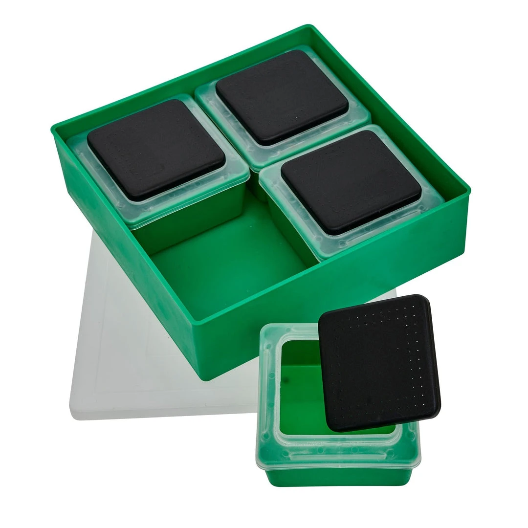 Great match fishing bait box set. 4 small boxes inside one large one. Ideal for pinkies, maggots, worm hookbaits, pellets or corn. Practical design that manages space on your side tray and packs away neatly.