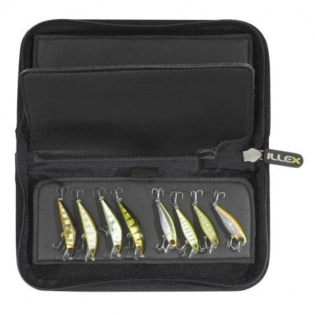 Wallet type storage pouch that will take plenty of small lures for trout and ultra-light fishing features two pocket separated by a rigid binder. Zipped fastening. Materials: Polyamid 600D/lining: soft waterproof PVC.