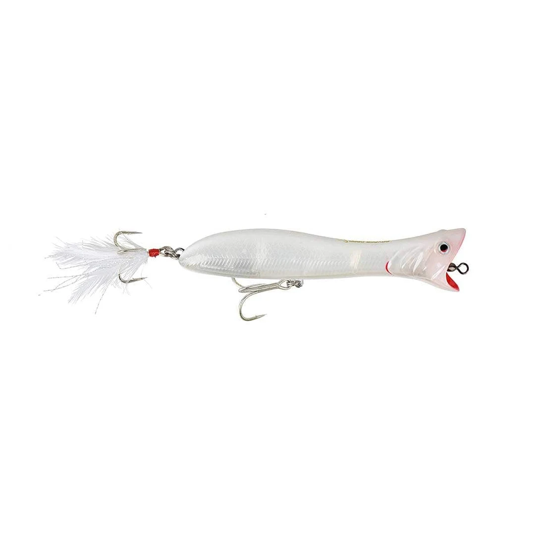 Superb long casting popper, with an extreme good Popping effect! The wide open Mouth, has a great hold in the water and really pops and splashes incredible. The lure also have a great track on regular retrieve, leaving a superb bubble trail and wake bow on the surface. The rear Y-treble hook folds up along the back on the cast and gives a very stable flight. Super Hard ABS Body, with thru going wire, extra strong split rings and Big fish trebles. Great lures for big brutal Saltwater predator fish!